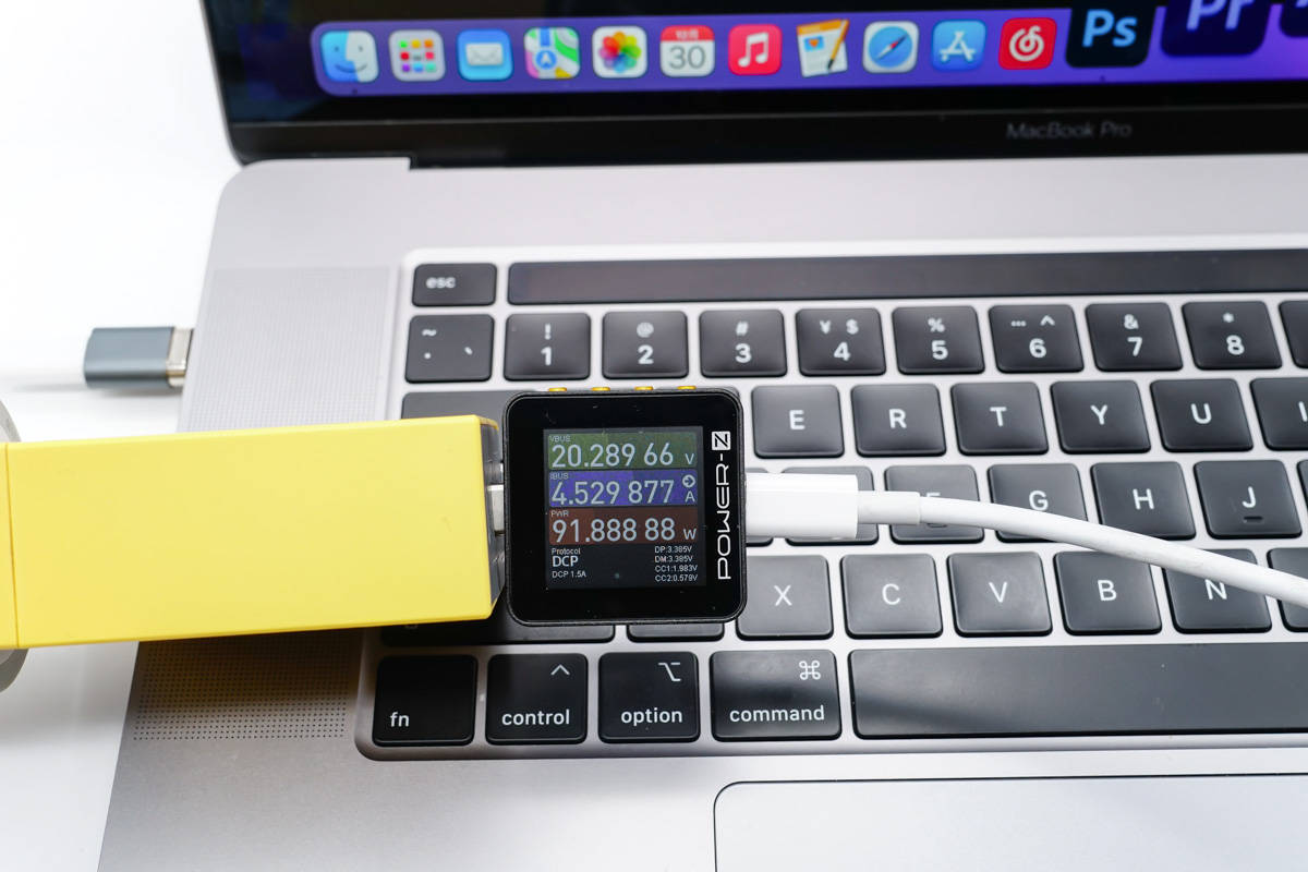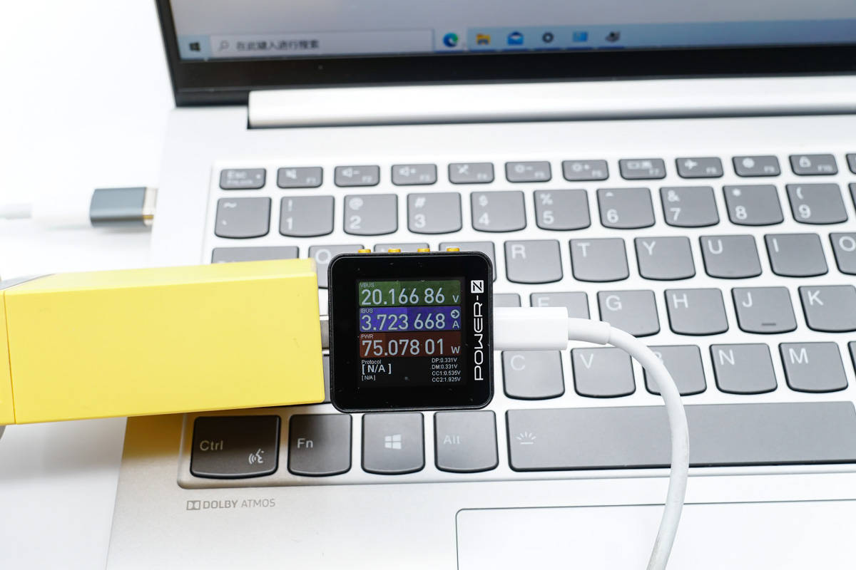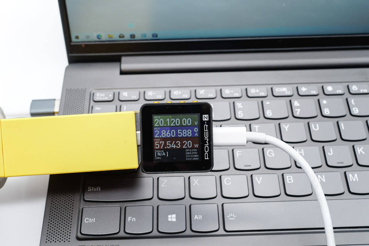 Ua ntej tshaj plaws, cia peb saib ntawm kev them nyiaj ceev. Siv lub charger 100W nrog lub taub hau ncaj nraim sib nqus kom them lub laptop nrog lub zog ntawm 20.12V 2.86A 57.54W.
