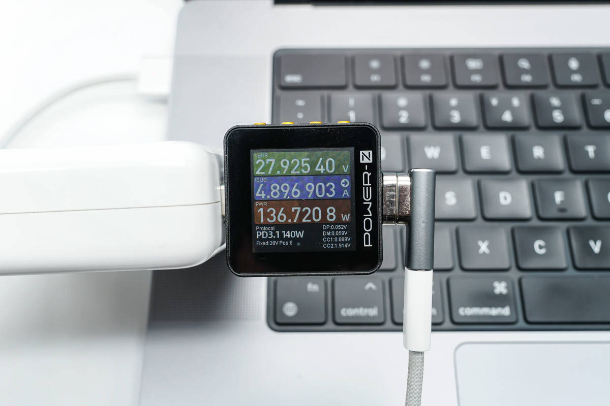 Txawm tias ... nws kuj txhawb nqa 140W ceev them, thiab lub adapter txuas nrog Apple lub 140W gallium nitride charger thiab MagSafe 3 ceev them cable. Lub sijhawm no, lub zog them yog 28V thiab lub zog yog 135.72W.