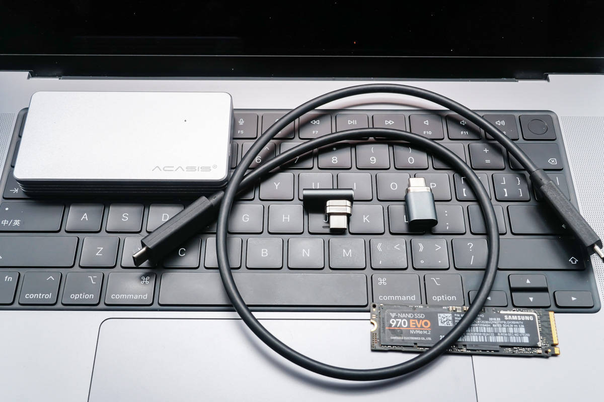 Tom ntej no, cia peb saib cov ntaub ntawv kis tau tus mob. Cov cuab yeej siv yog Samsung 970 EVO solid-state drive, Thunderbolt 3 hard disk box, Thunderbolt 3 cov ntaub ntawv cable, thiab ob lub adapters.
